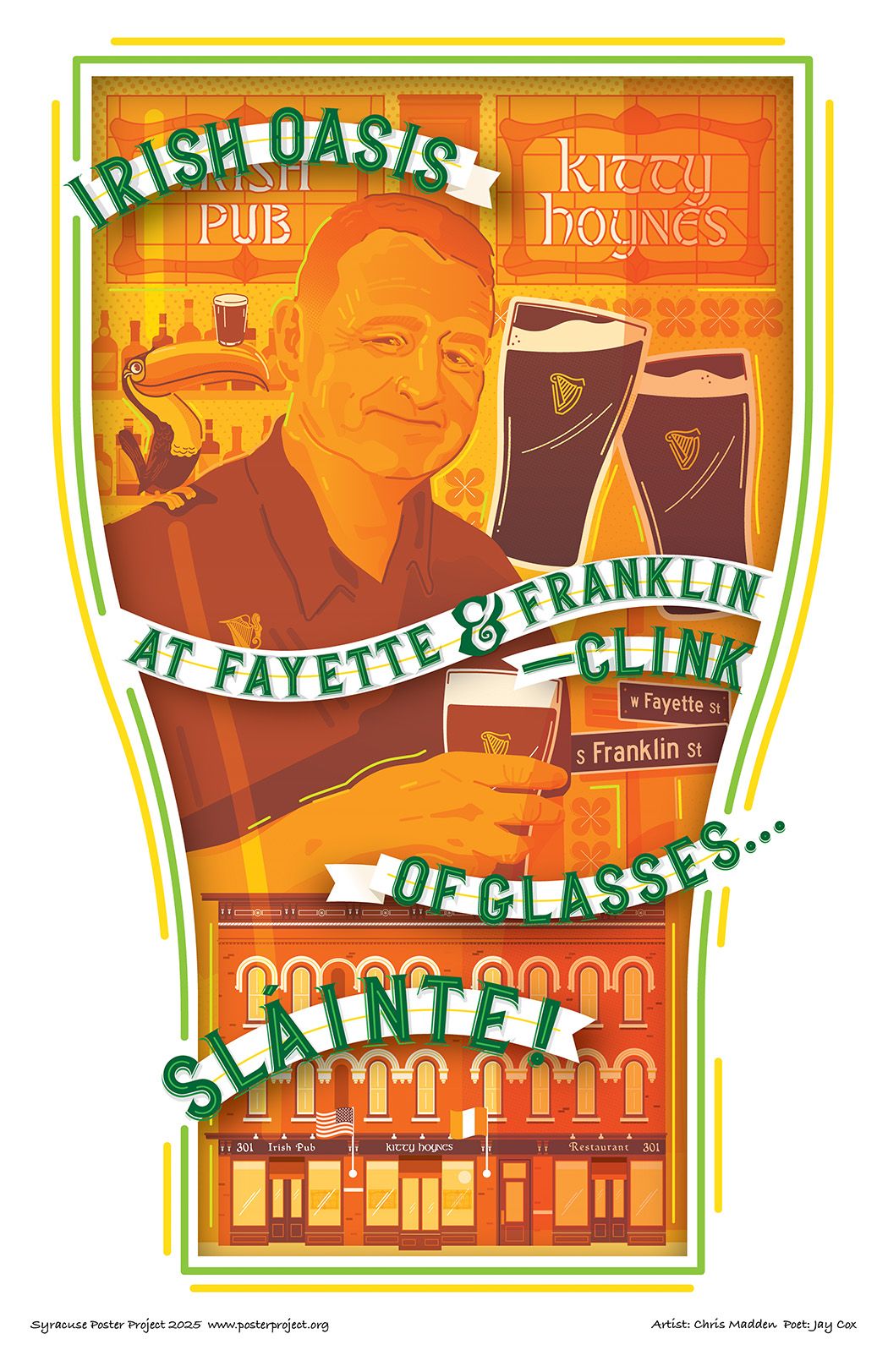 When I saw the list of local businesses selected for this year’s Poster Project, I knew I had to create a poster for Kitty Hoynes. For over 25 years, it has been a beloved Syracuse institution and a truly one-of-a-kind spot. I’ve always enjoyed spending time there, sharing a pint of Guinness with friends. For my illustration, I aimed to capture the essence of what you might experience at Kitty Hoynes on any given day. This year I had the privilege of collaborating with my friend, poet Jay Cox, whose words inspired and guided me through the creative process
