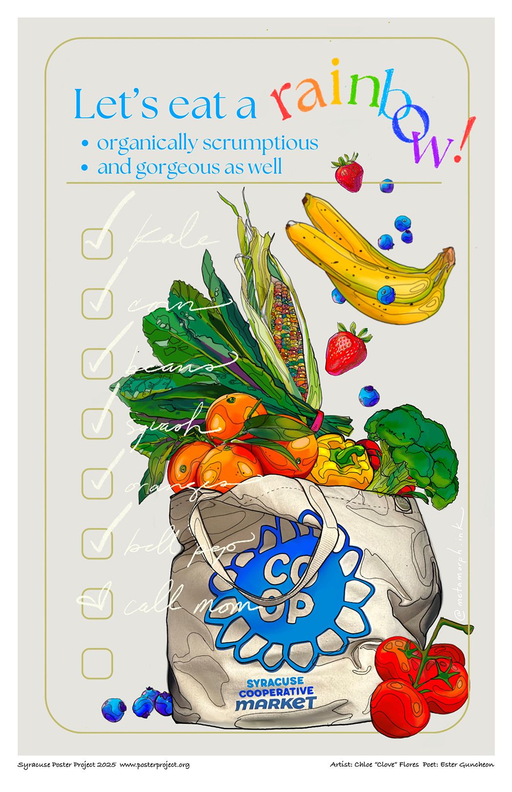 I was very inspired by the way the "Syracuse Cooperative Market" wrote about their food co-op, employees, patrons, and the longevity within the community. The business glowed through their words. Being a consumer and supporter of markets and organic produce, imagination joined with the description of the market experience, culminating in bringing a rainbow of images and fragrances of luscious produce, plus other treasures to mind.