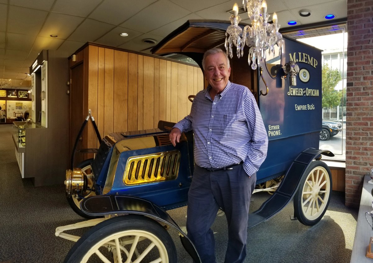 The 1903 Iroquois delivery truck. Originally owned by founder Michael Lemp to deliver watch and clock repairs it was the second motorized vehicle in Syracuse. It has been on display in the store for more than 4 decades.