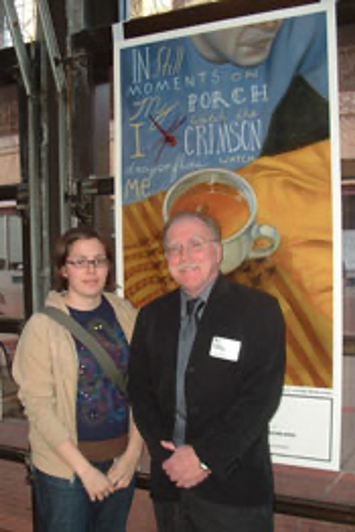 David Forest Hitichcock, poet, and his mother, Barbara McVey Hitchcock, with poster illustrated by Q. Cassetti.