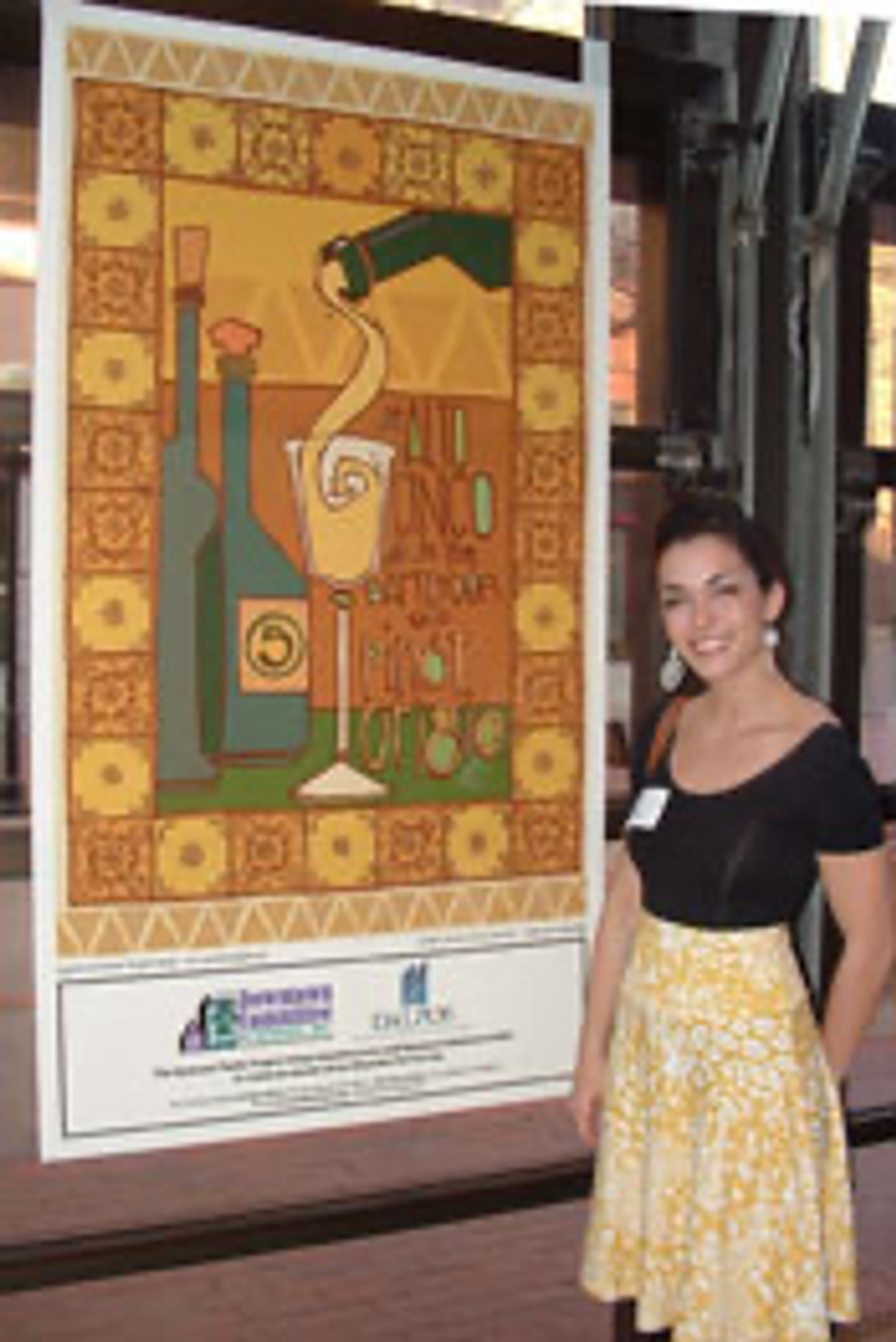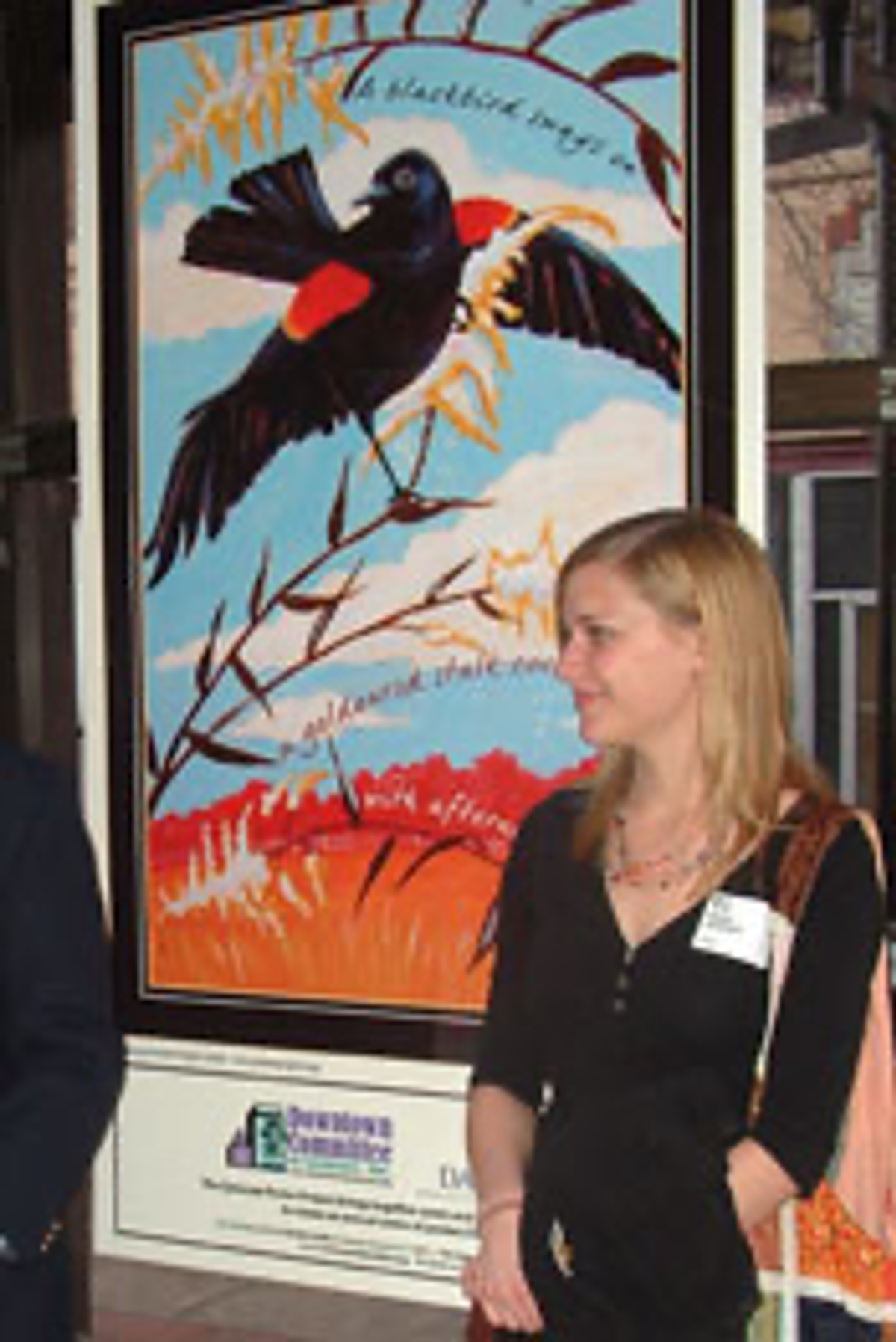 Emily Meluch, artist, with poster featuring poem by Janine DeBaise.