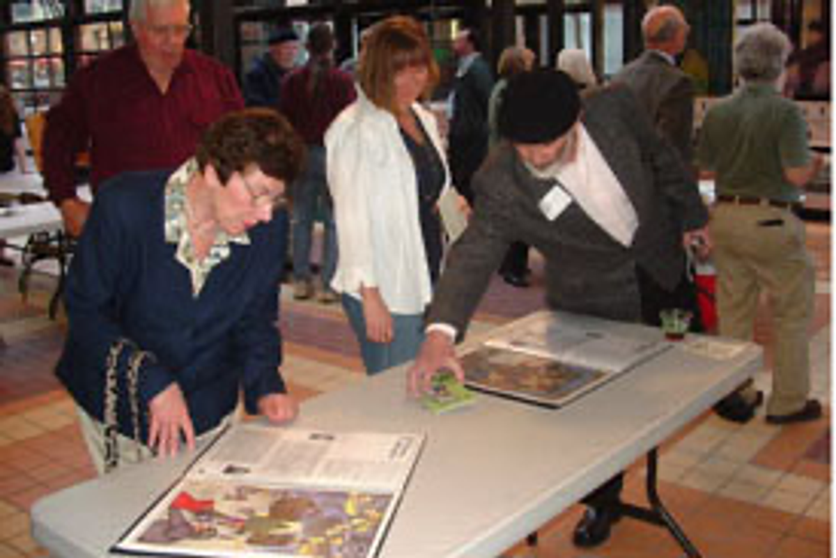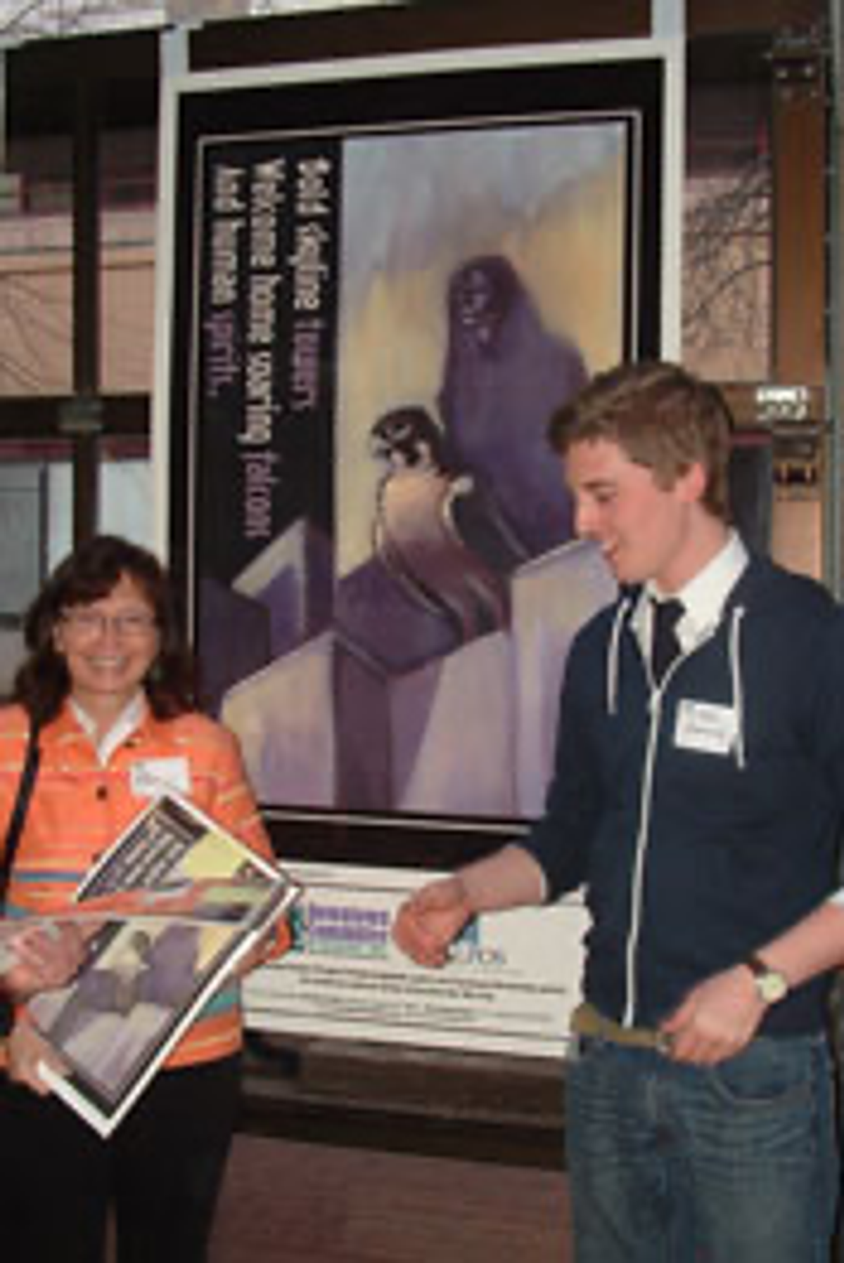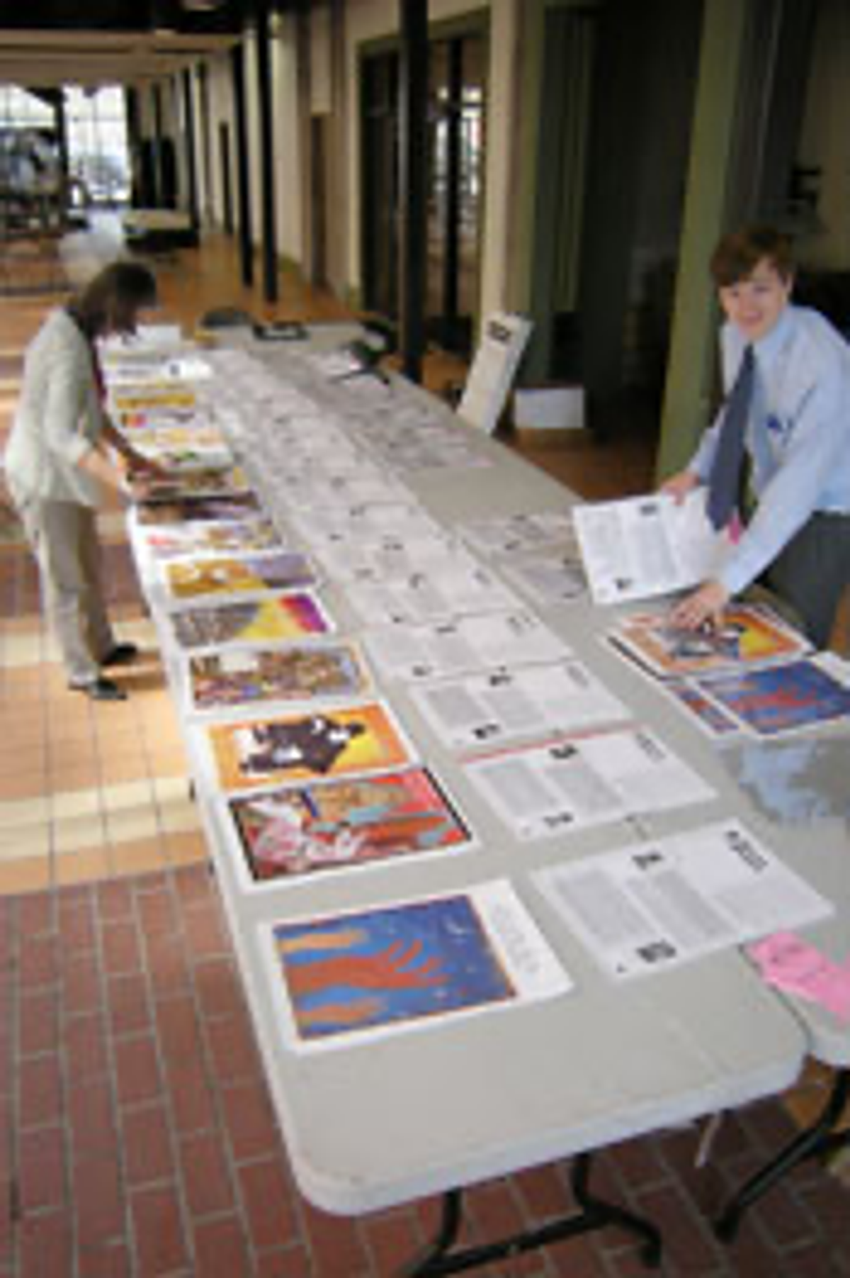 Jancy Ball and Ben Sio, board members, assemble poster prints.