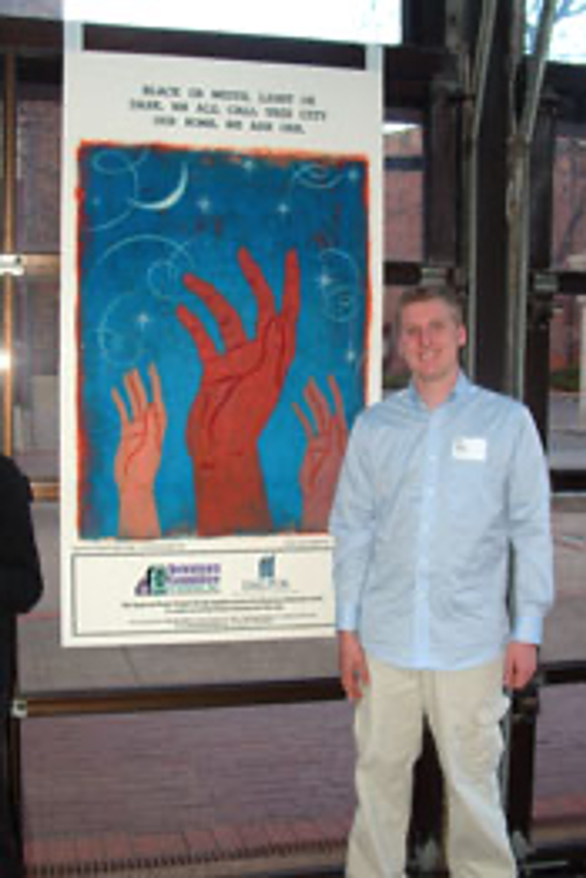 Devin Scannell, artist, with poster featuring poem by Jay Cox.