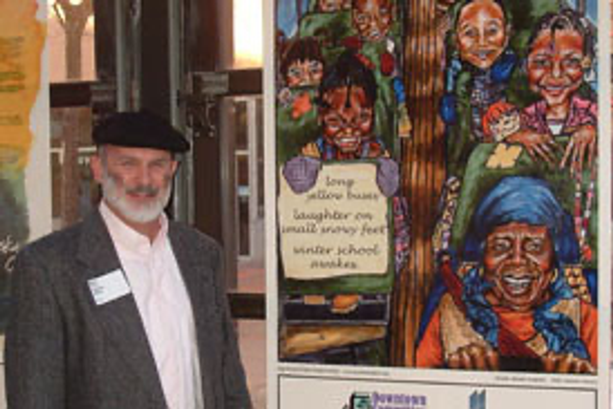Matt Sattler, poet, with poster illustrated by Don Kilpatrick.